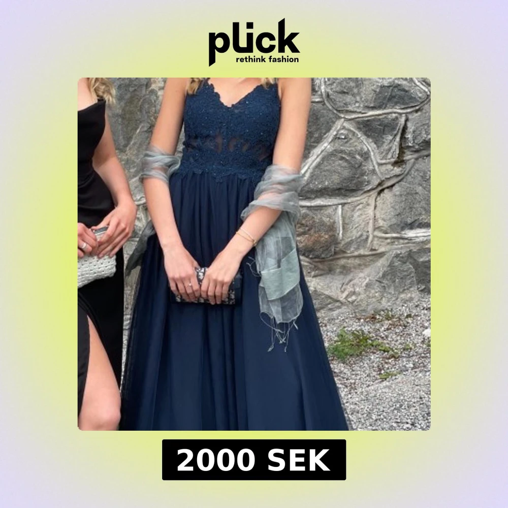 Säljer en marinblå långklänning med v-ringad spetsliv och axelbandslös design. Kjolen är i flera lager tyll för en extra elegant look. Perfekt för bal eller fest. Klänningen har öppen rygg och smala axelband.