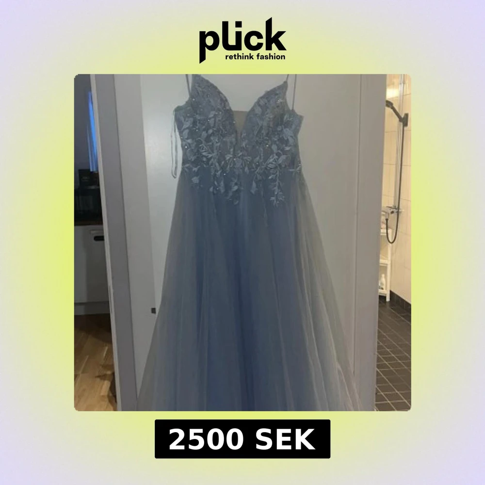 Magisk ljusblå långklänning med tunna axelband, djup v-ringning och vackra spetsapplikationer med blommönster upptill. Kjolen är i flera lager tunn tyll som ger en drömmig känsla. Snörning i ryggen för perfekt passform. Perfekt för bal eller student!