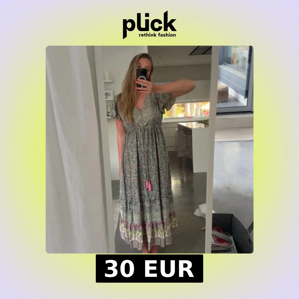 Superfin långklänning med blommigt mönster i grönt, rosa och lila toner. Klänningen har v-ringning, korta volangärmar och snörning med tofsar framtill. Den har flera volanglager nertill och en luftig passform, perfekt för varma dagar.