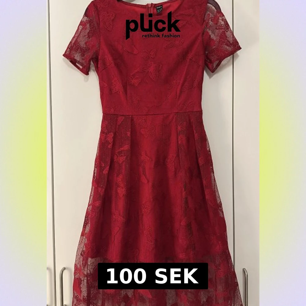 Röd kortklänning från SHEIN med vackert spetsöverdrag och fjärilsmönster. Klänningen har rund hals, korta ärmar i transparent spets och dragkedja bak. Kjolen är lätt utställd och tyget är mjukt och följsamt. Perfekt för dig som vill sticka ut med en romantisk look.