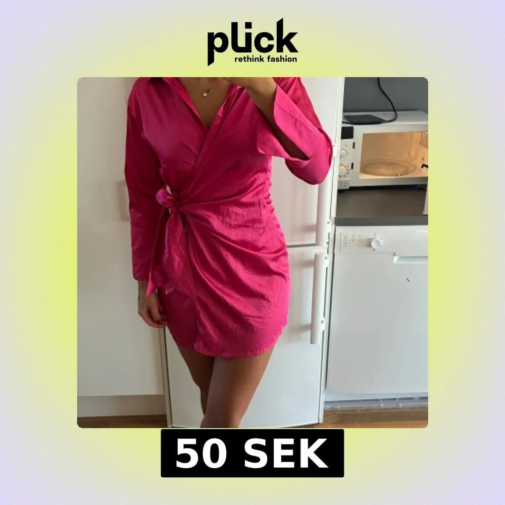 Säljer en snygg kort rosa klänning med omlott-design och knyt i sidan. Klänningen har långärmade ärmar med breda manschetter och en krage som ger en cool skjortkänsla. Materialet är glansigt och känns lätt mot huden, perfekt för dig som gillar att sticka ut.