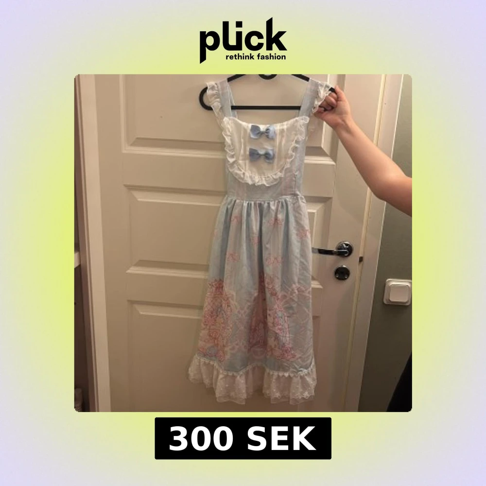 Supersöt Lolita klänning i ljusblått med vita och rosa detaljer, dekorerad med gulligt kattmotiv och rosetter framtill. Klänningen har volangkant, breda axelband och knytband i ryggen. Materialet känns som bomull och polyester, perfekt för dig som älskar kawaii och unika prints.