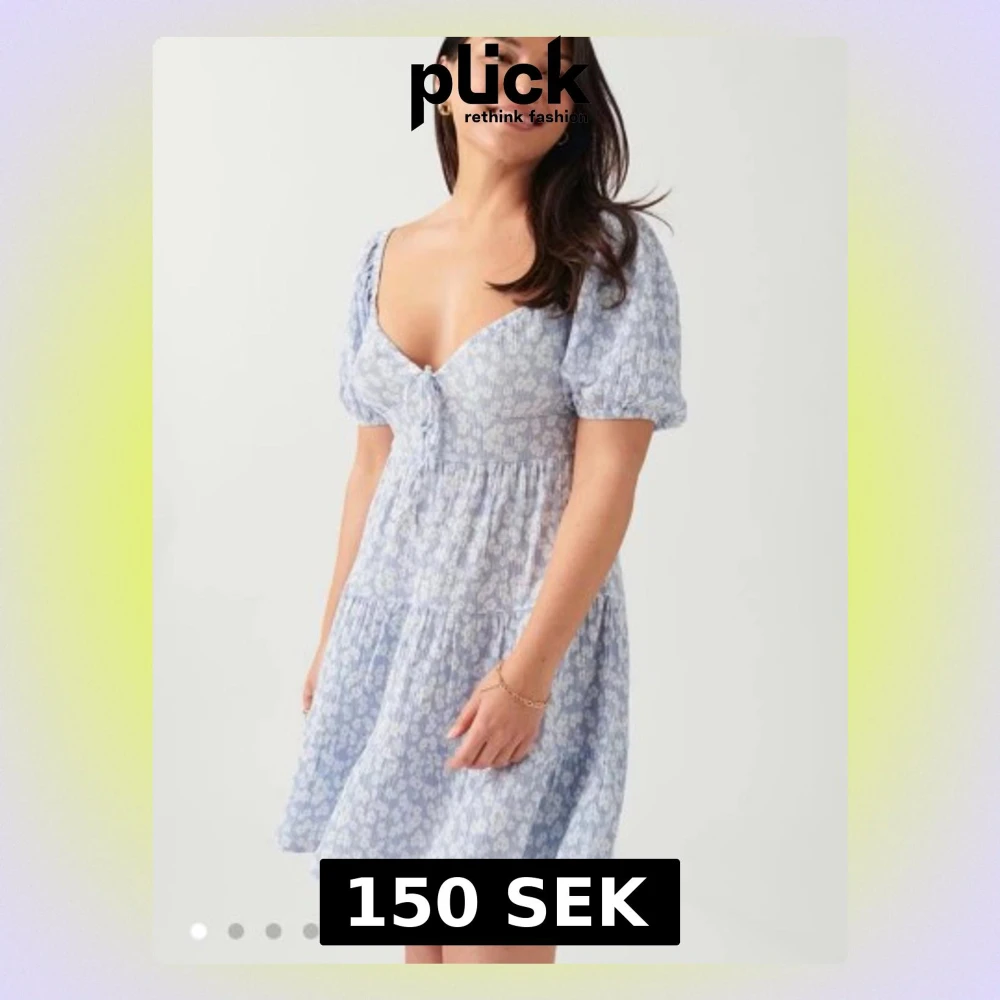 Supersöt ljusblå kortklänning med vita blommor, puffärmar och knyt framtill. Klänningen har en lätt v-ringad urringning och volang i kjolen. Perfekt för sommarens alla tillfällen! Köpt för 300kr. Nästan aldrig använd Pris kan diskuteras.