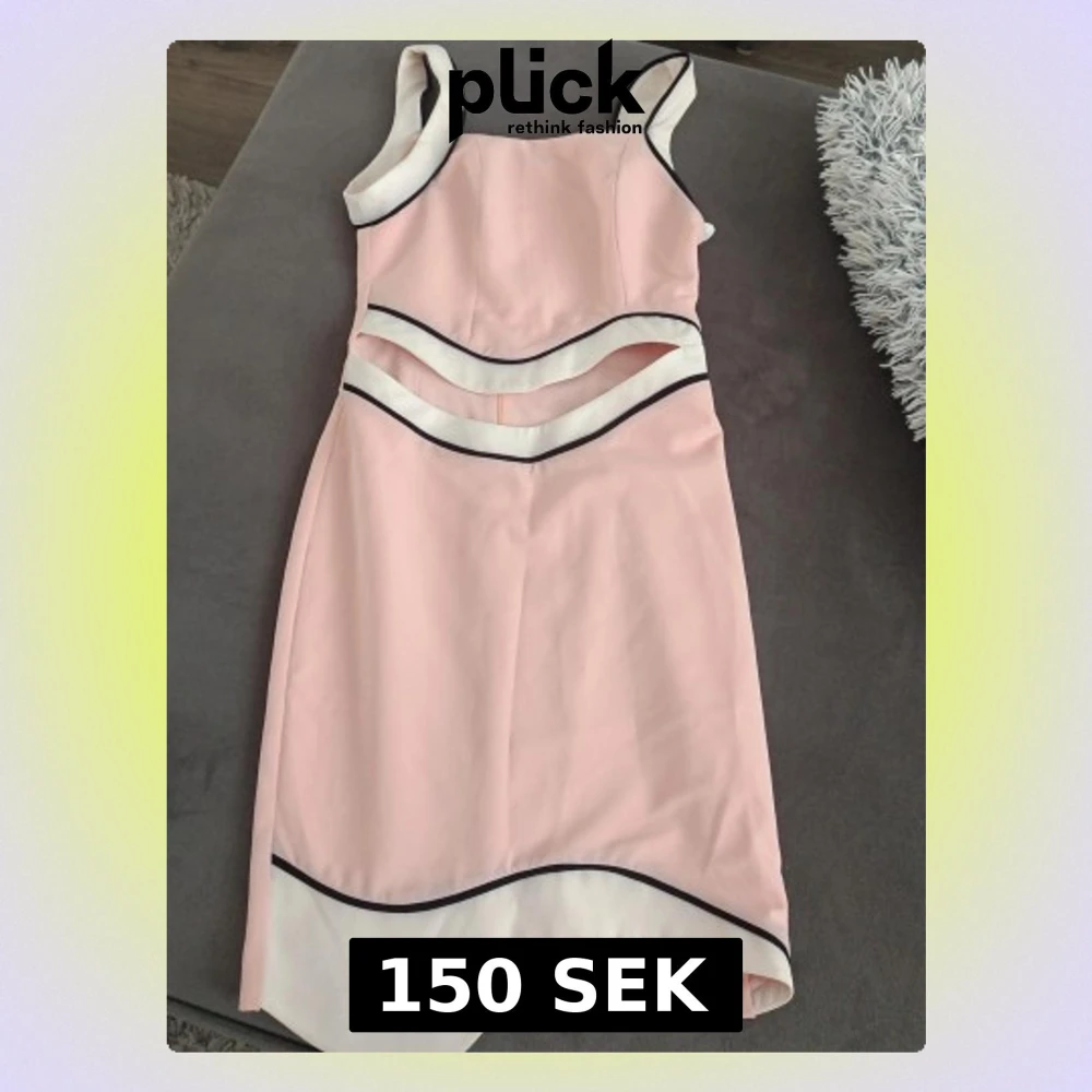 Säljer en oanvänd ljusrosa klänning med vita och svarta kontrastkanter. Klänningen har breda axelband, cut out-detaljer i midjan och asymmetrisk nederkant. Materialet känns som polyester och modellen är figurnära med en modern twist.