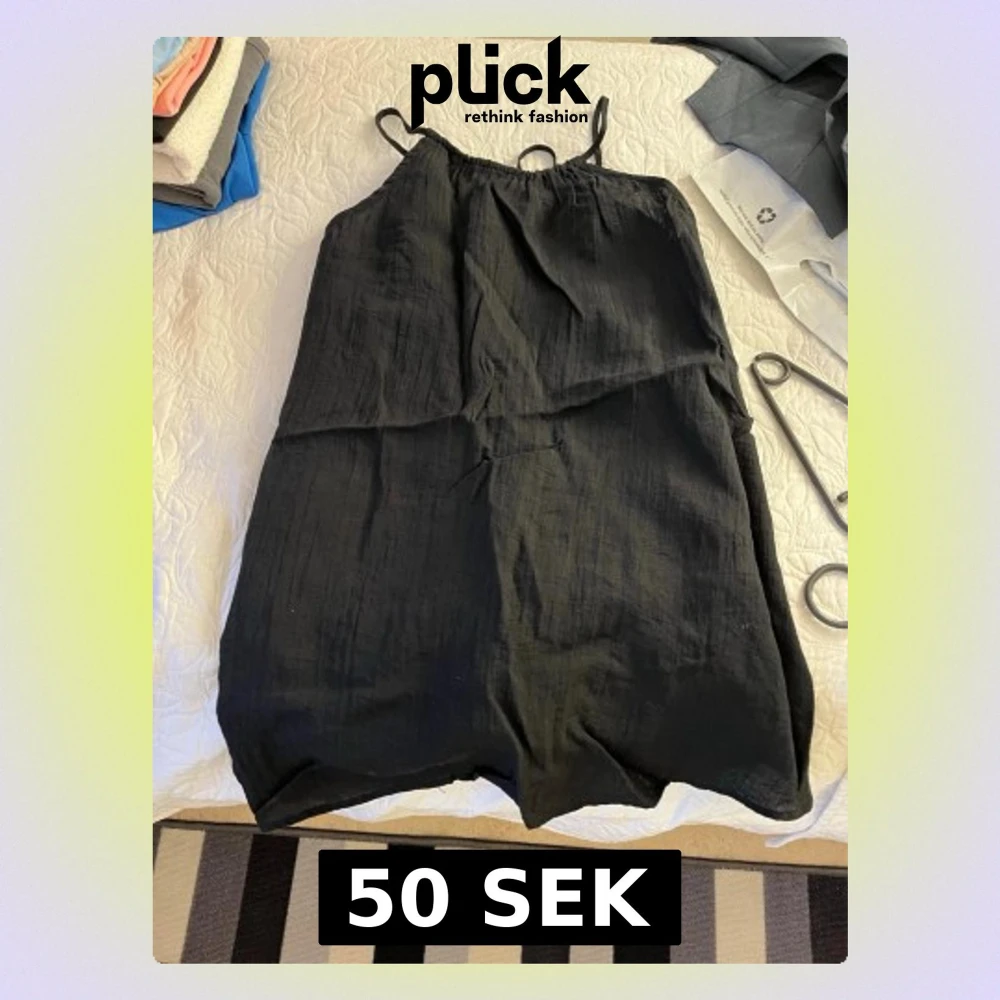 En enkel svart klänning med tunna axelband och rak passform. Perfekt för varma dagar och lätt att styla med accessoarer. Tillverkad i ett mjukt och luftigt material som känns skönt mot huden.