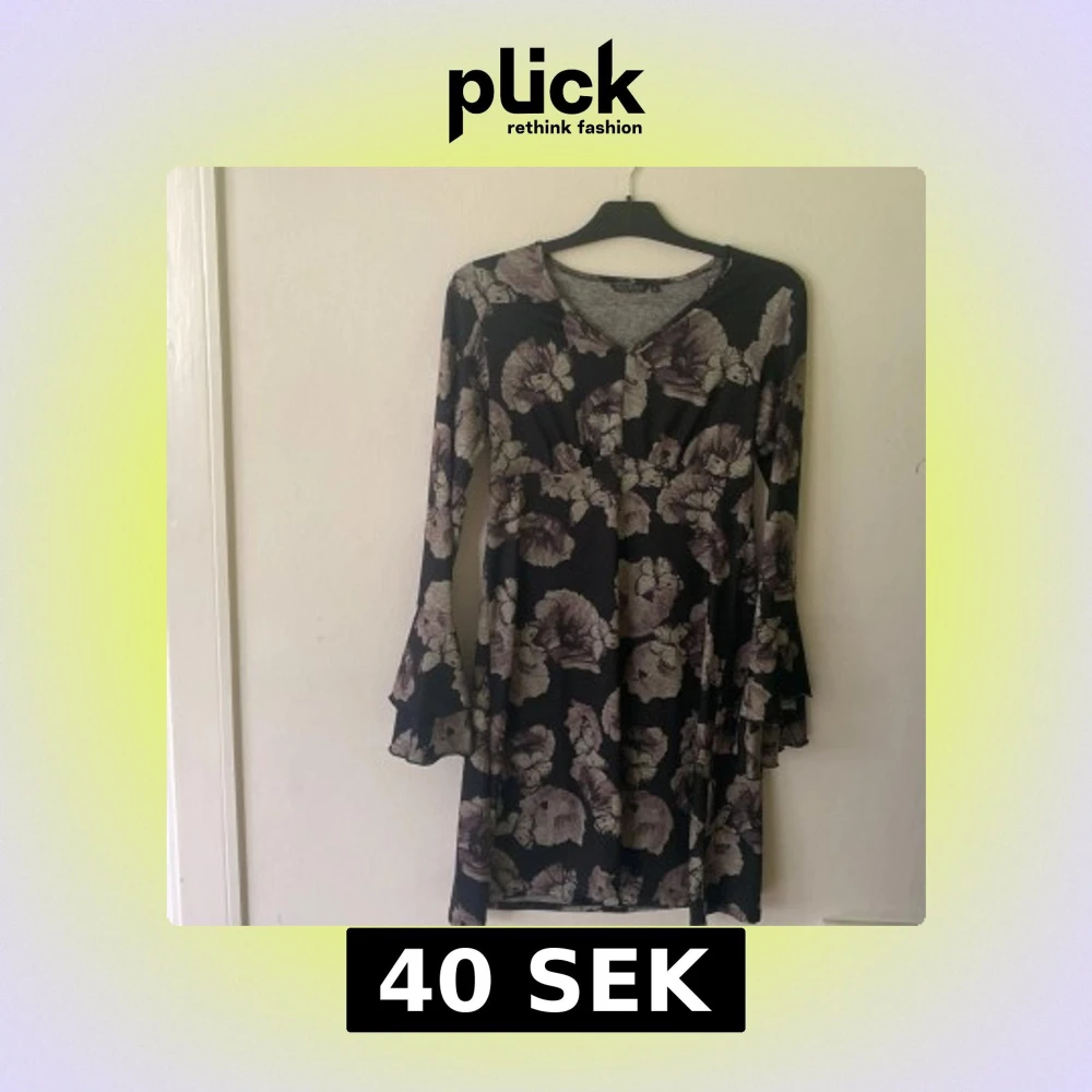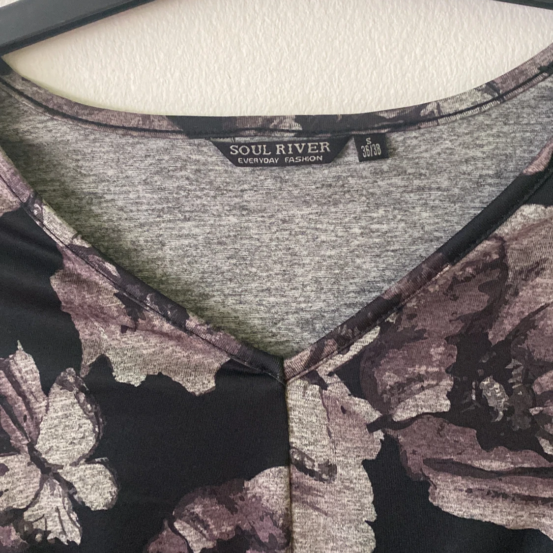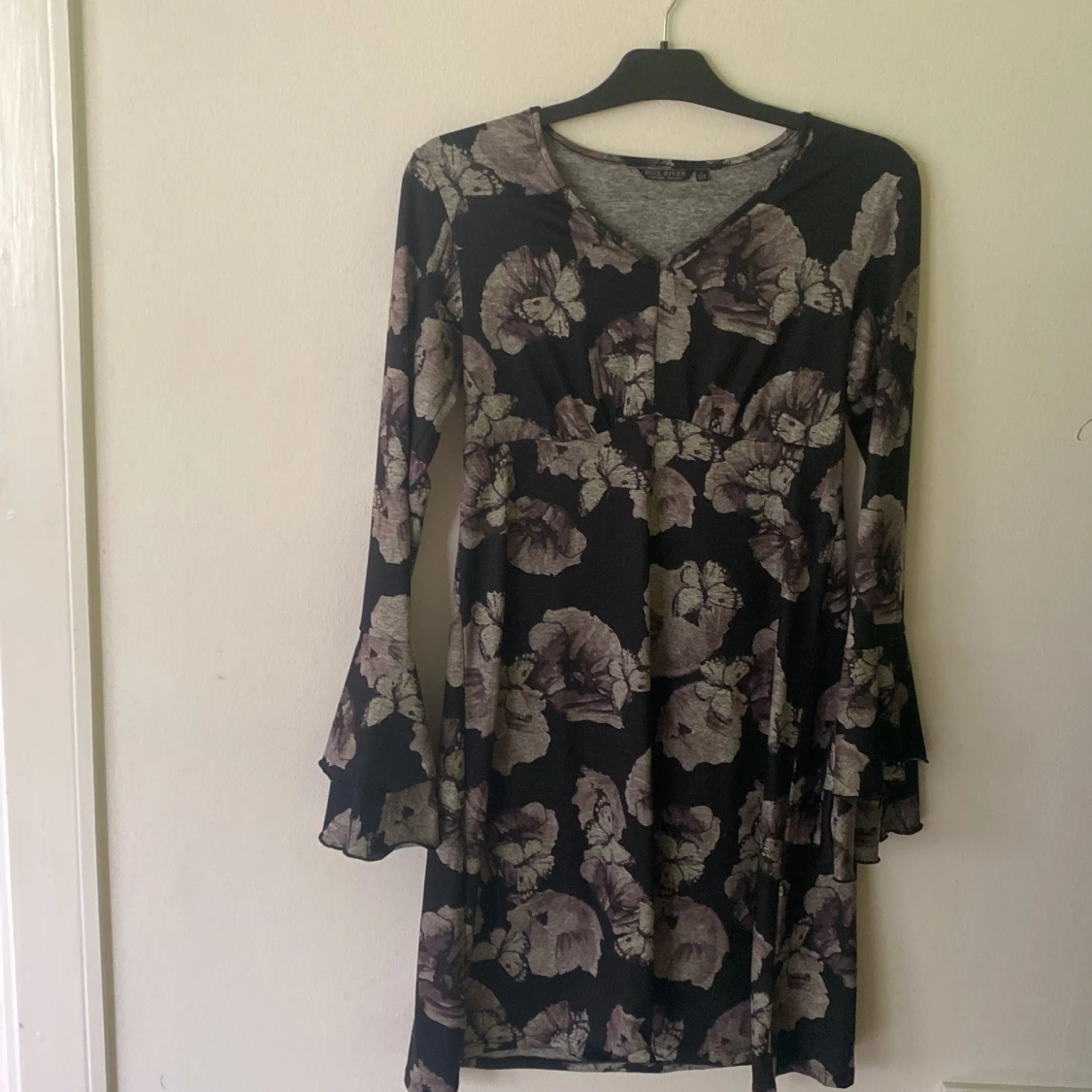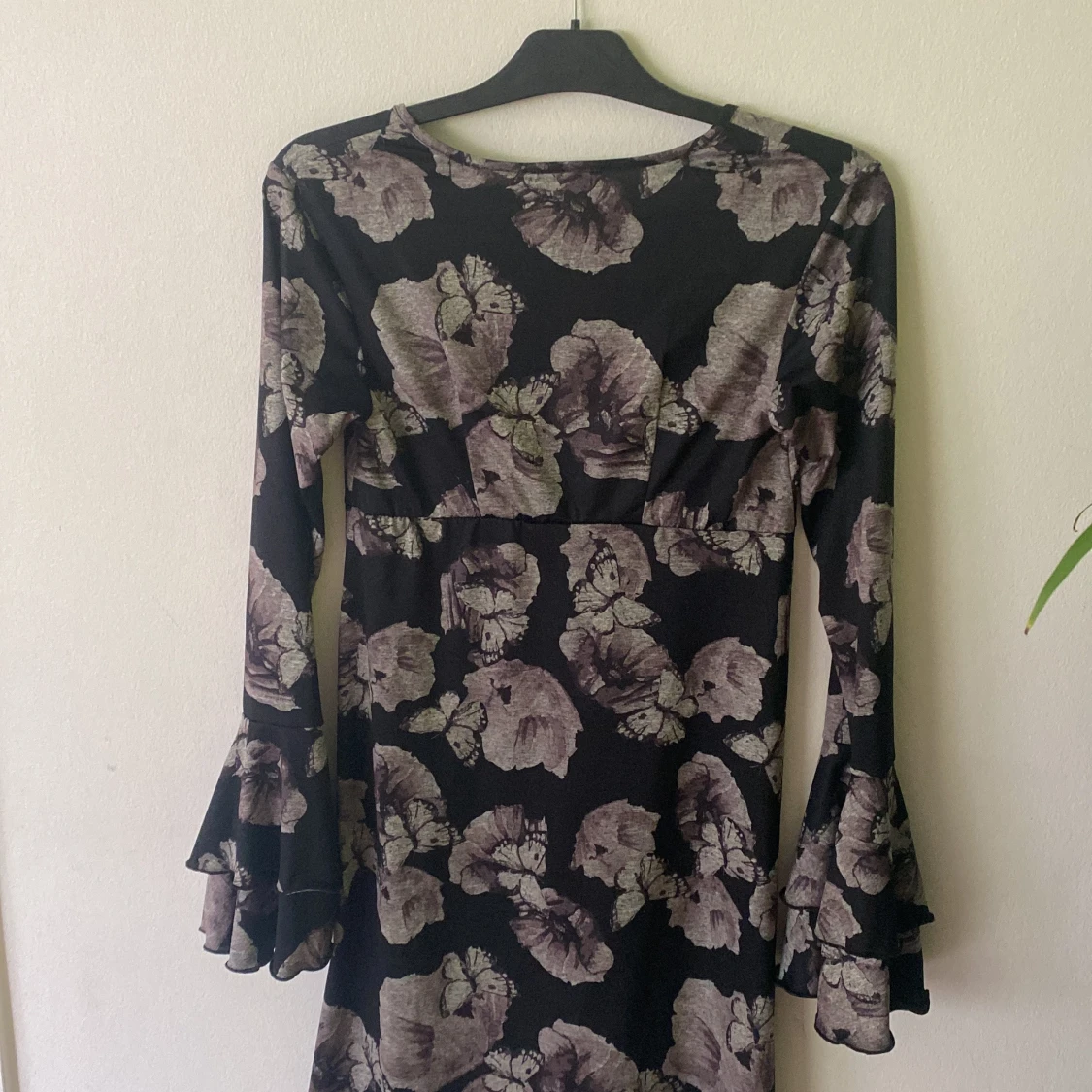 Supersnygg svart kortklänning från Soul River med lila och grått blommönster. Klänningen har v-ringning och långa trumpetärmar. Perfekt för dig som gillar en feminin och trendig stil.
