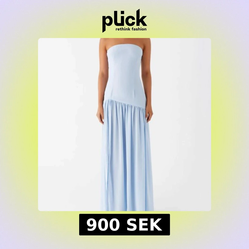 Säljer en ljusblå axelbandslös långklänning med figurnära överdel och utsvängd kjol. Klänningen har en asymmetrisk midjesöm och faller snyggt ner mot golvet. Perfekt för dig som vill ha en stilren och elegant look.