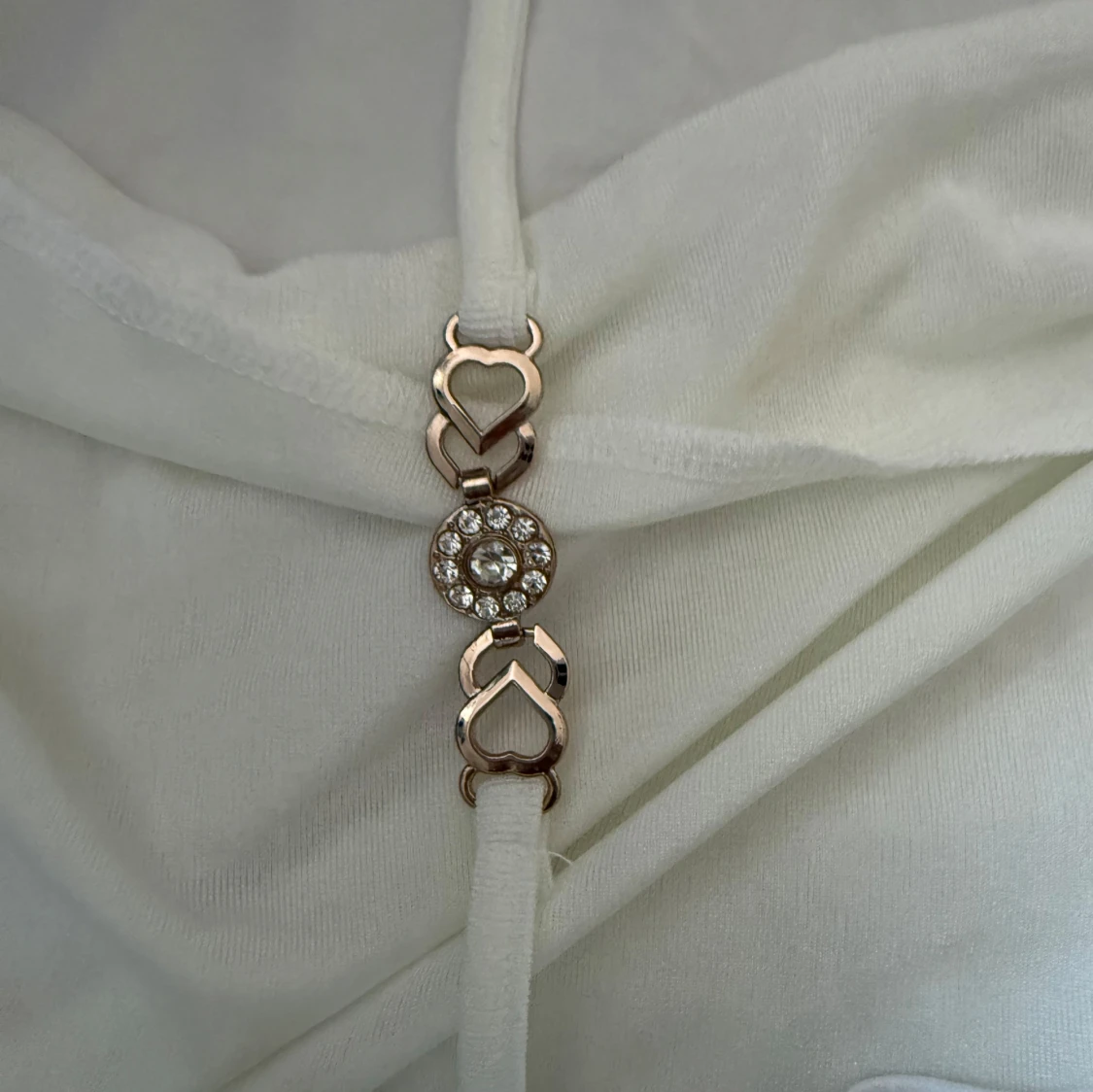 Elegant vit långklänning med smala axelband och snygga guldfärgade detaljer med hjärtan och glittrande stenar framtill. Klänningen har en mjuk och följsam känsla, perfekt för dig som vill sticka ut med en stilren look.