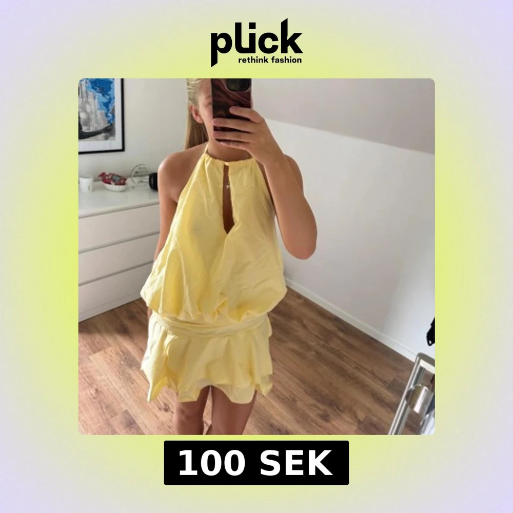Superfin ljusgul kortklänning med halterneck och volangdetaljer.