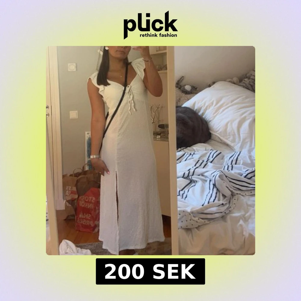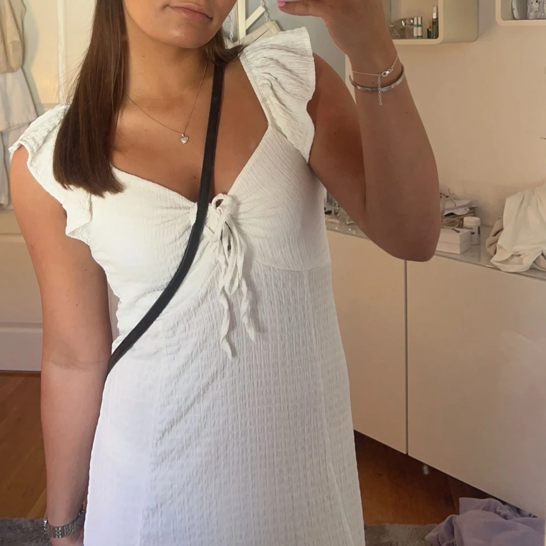 Säljer en vit långklänning med volangdetaljer vid axlarna och knyt framtill.