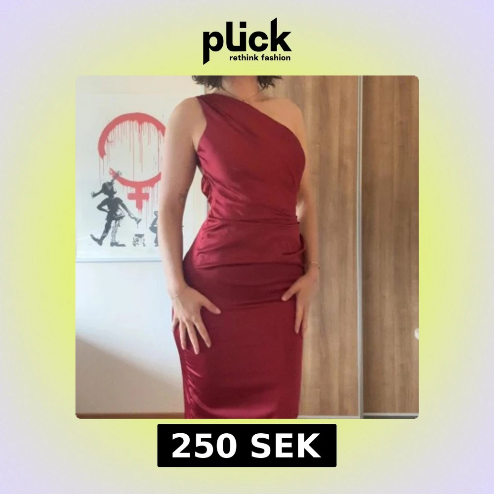 Säljer en vinröd långklänning i satin från Babyboo. Klänningen har en elegant one shoulder-design och öppen rygg. Snygg figurnära passform som framhäver siluetten. Perfekt för speciella tillfällen.
