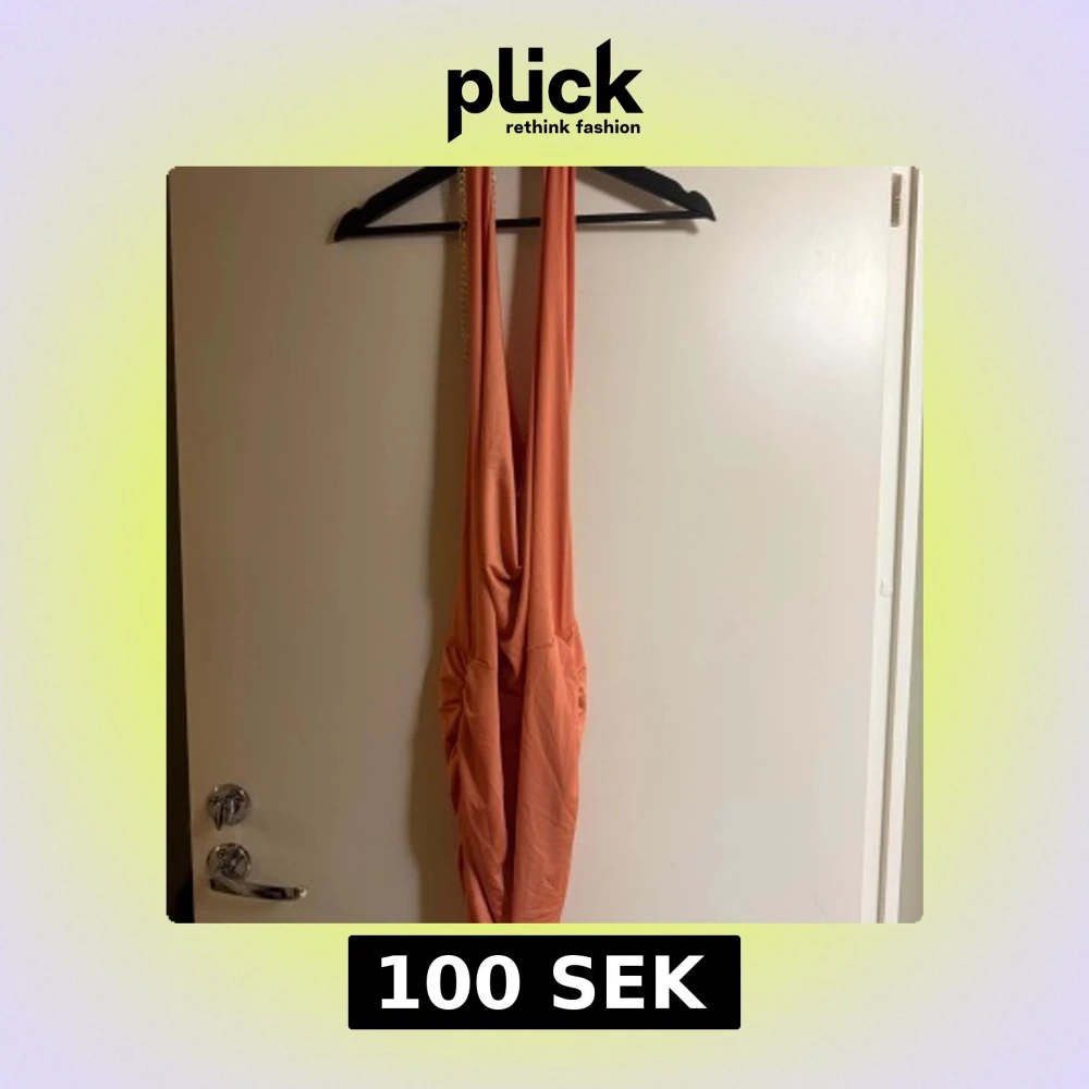 Trendig orange klänning med kedjedetalj och rynkad design. Perfekt för en somrig look med sin ärmlösa stil och mjuka material.