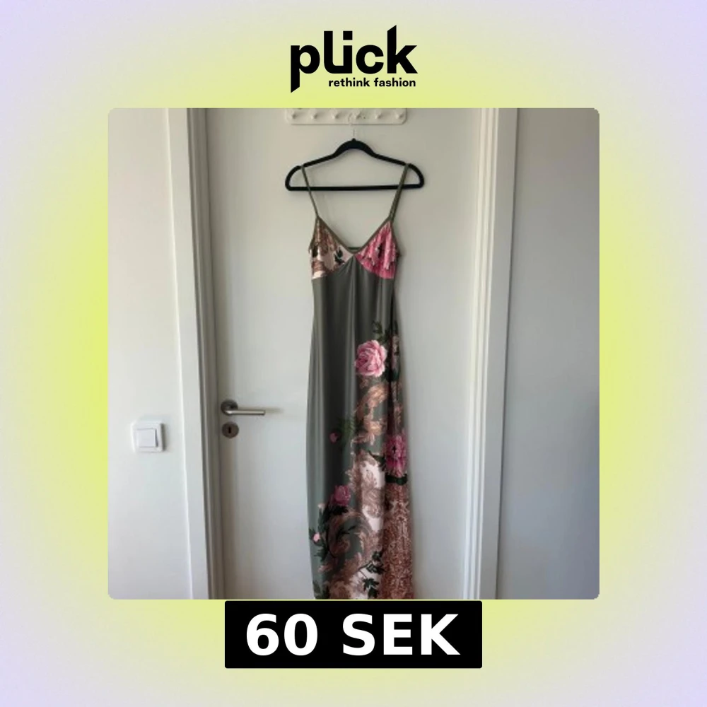 Supersnygg långklänning med smala axelband och blommigt mönster i rosa, grönt och beige på en dov grågrön bas. Klänningen är från SHEIN och är helt nt och oanvänd!