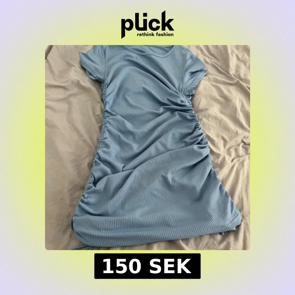 Supersöt ljusblå kortklänning med ribbat tyg och snörning längs sidorna som ger en snygg rynkad effekt. Klänningen har korta ärmar och rund halsringning. Perfekt för dig som gillar en enkel men trendig look.