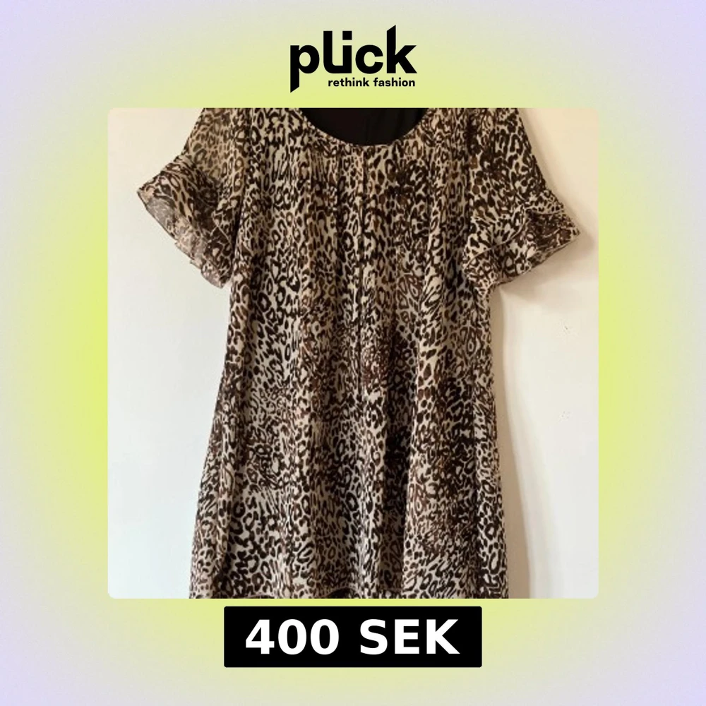 Snygg kortklänning med leopardmönster i beige och bruna toner. Klänningen har volangdetaljer på ärmar och nederkant, samt en rund halsringning. Materialet är lätt och transparent, perfekt för dig som vill sticka ut med ett djuriskt print.