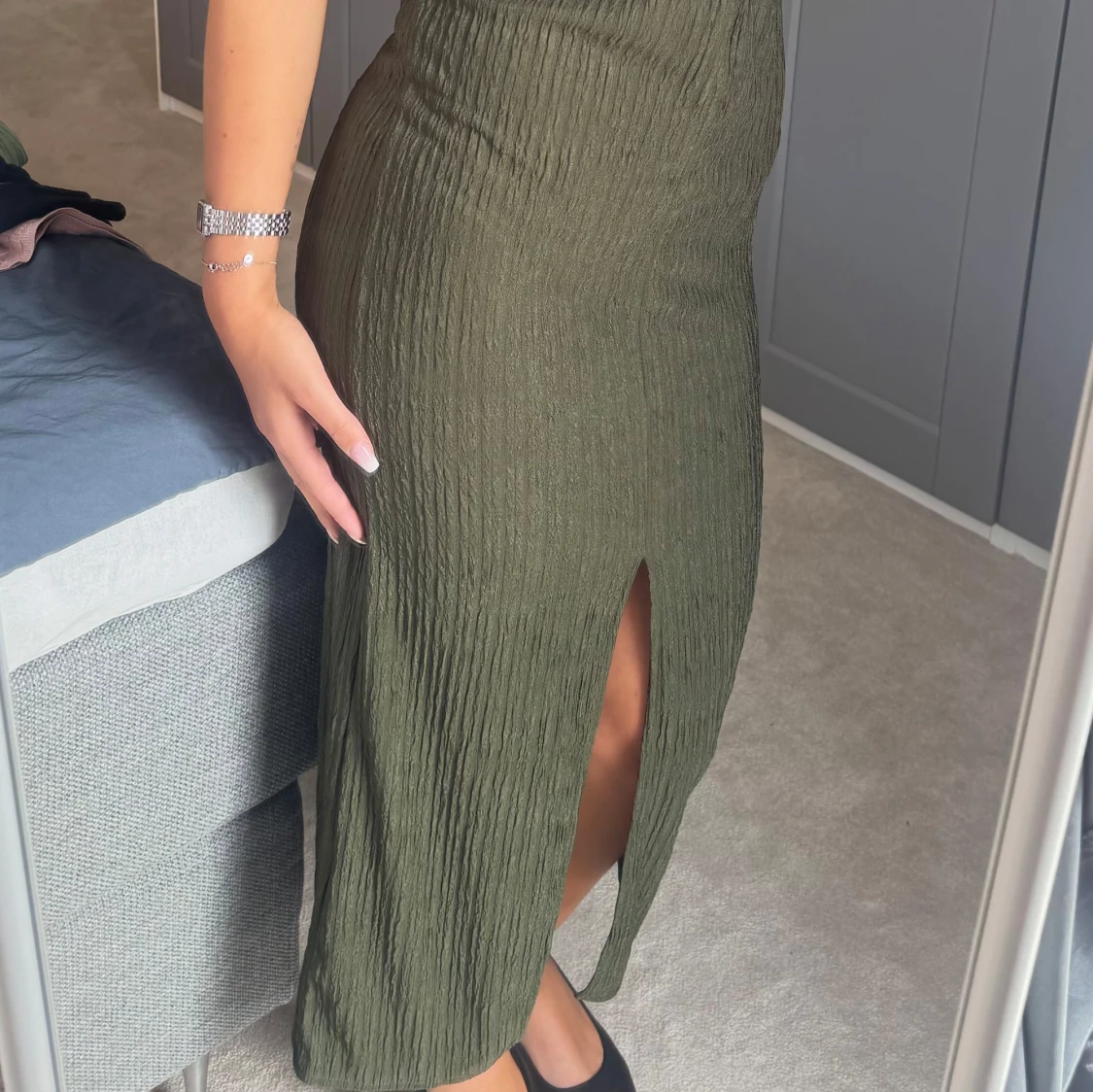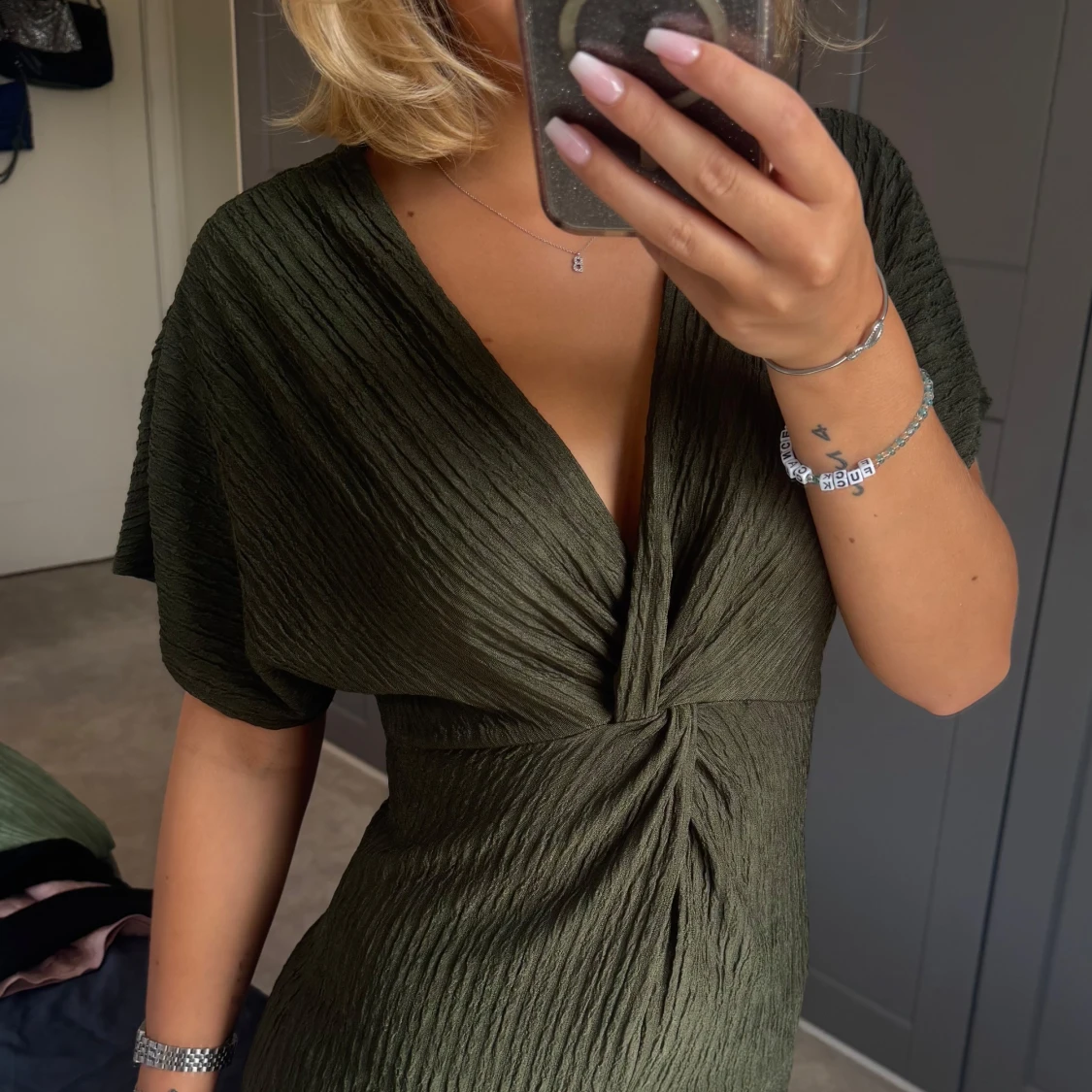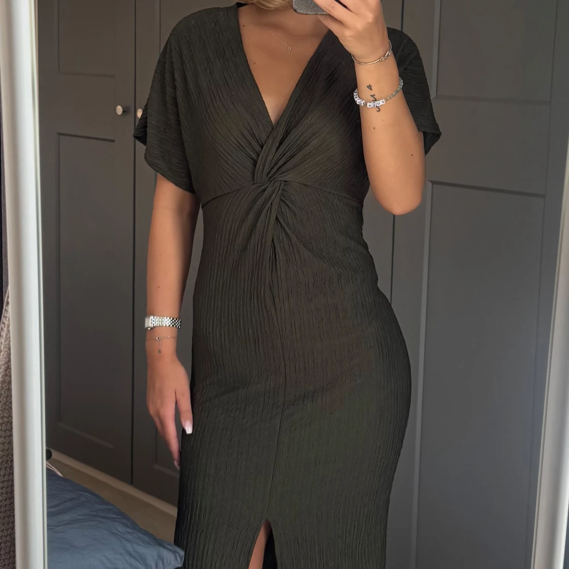 Säljer en olivgrön långklänning med snygg omlott och v-ringad hals. Figurnära passform och superbekväm att bära.