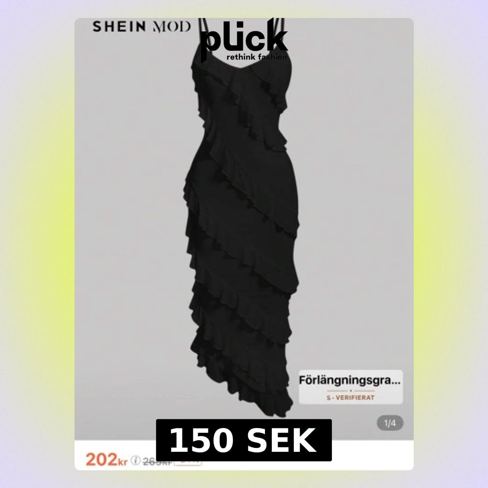 Snygg svart klänning med smala axelband och asymmetriska volanger som ger en cool och trendig look. Klänningen har en figurnära passform och är tillverkad i ett lätt syntetmaterial. Perfekt för dig som gillar att sticka ut med detaljer! Oanvänd!