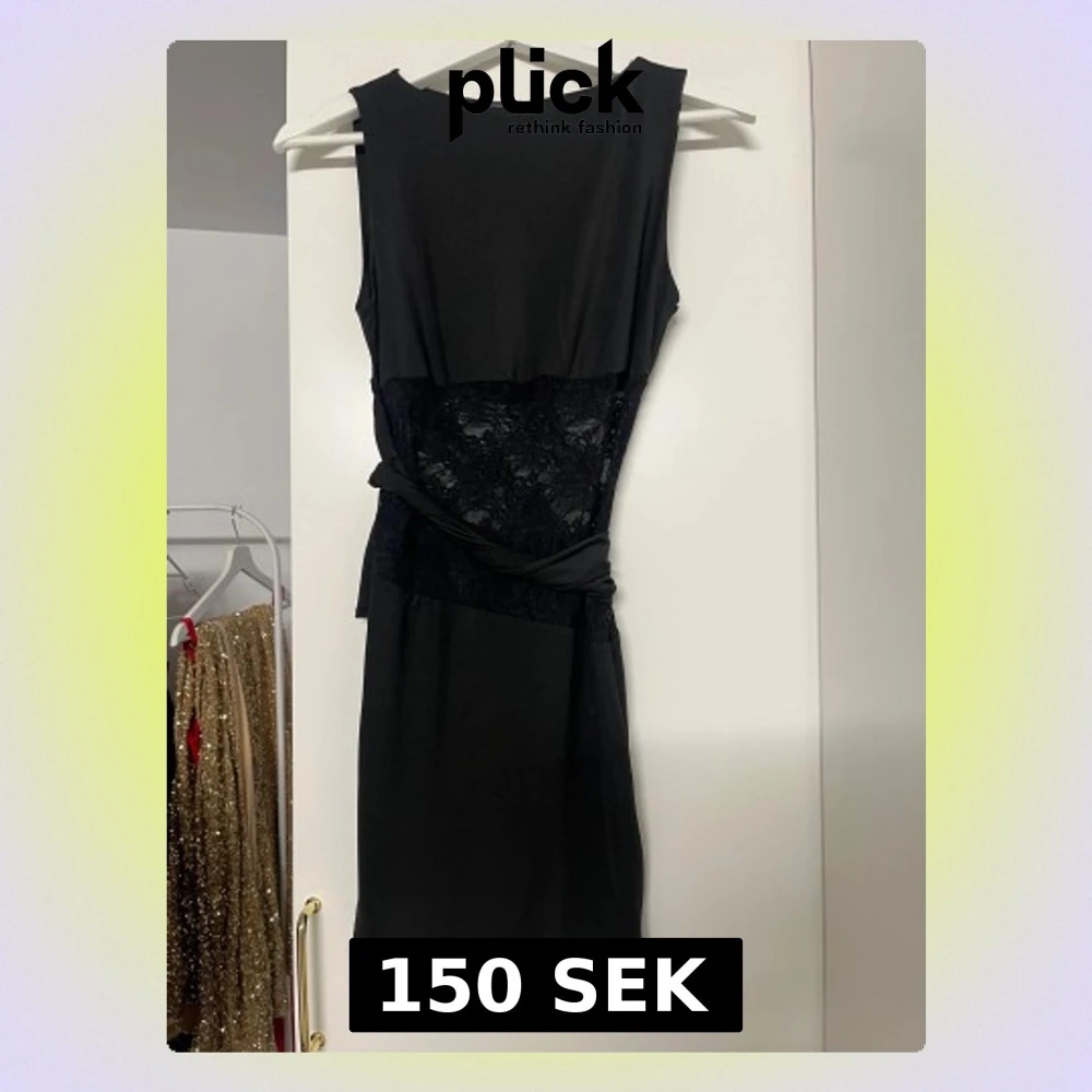 Snygg svart klänning med spetsdetalj i midjan och omlottband. Ärmlös design och rund halsringning ger en stilren look. Perfekt för dig som gillar en enkel men ändå elegant stil. Materialet känns mjukt och följsamt mot kroppen.