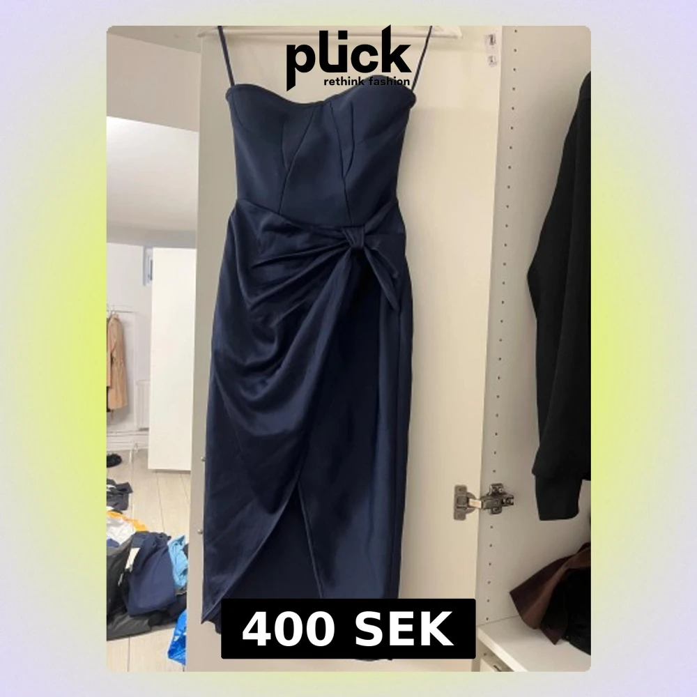 Snygg marinblå långklänning med smala axelband och omlott-detalj framtill. Klänningen har en stor rosett i midjan och en elegant drapering som ger en cool och stilren look. Perfekt för dig som vill sticka ut med en chic och modern stil.