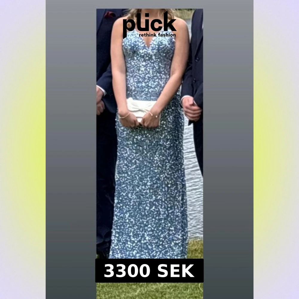 Supersnygg blå långklänning med massor av glitter och smala axelband. Djup v-ringning och figurnära passform som ger en elegant siluett. Perfekt för bal eller fest där du vill sticka ut och glänsa. Materialet är glittrigt och skimrande, vilket ger en lyxig känsla.