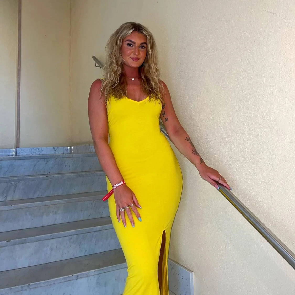 Säljer en snygg gul långklänning med v-ringad hals och smala axelband. Klänningen har en figurnära passform och en slits framtill som ger en cool touch. Perfekt för sommarens alla tillfällen och riktigt skön att bära. Fråga gärna om fler bilder eller mått!