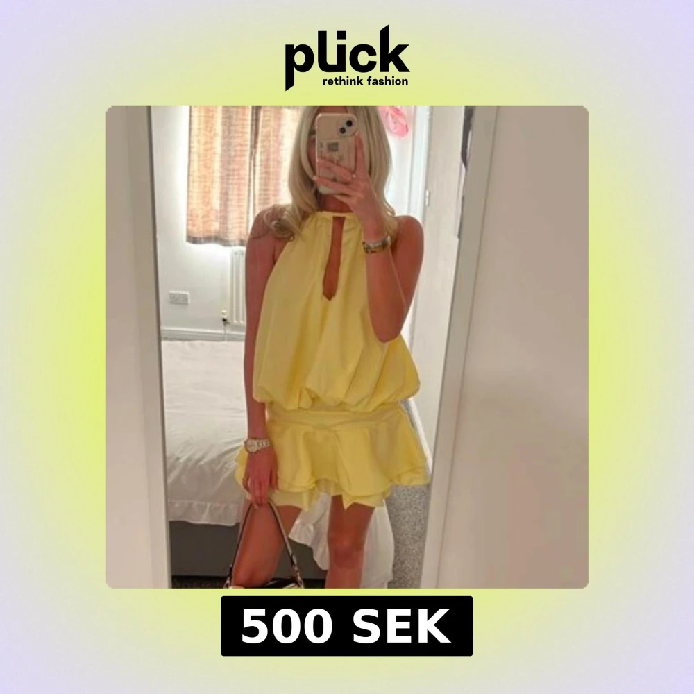 Säljer en min favorit klänning! En så söt gul klänning med volangkjol och nyckelhålsringning fram. Klänningen har ärmlös design och en lös passform upptill som ger en luftig känsla. Perfekt för varma dagar och somriga tillfällen!