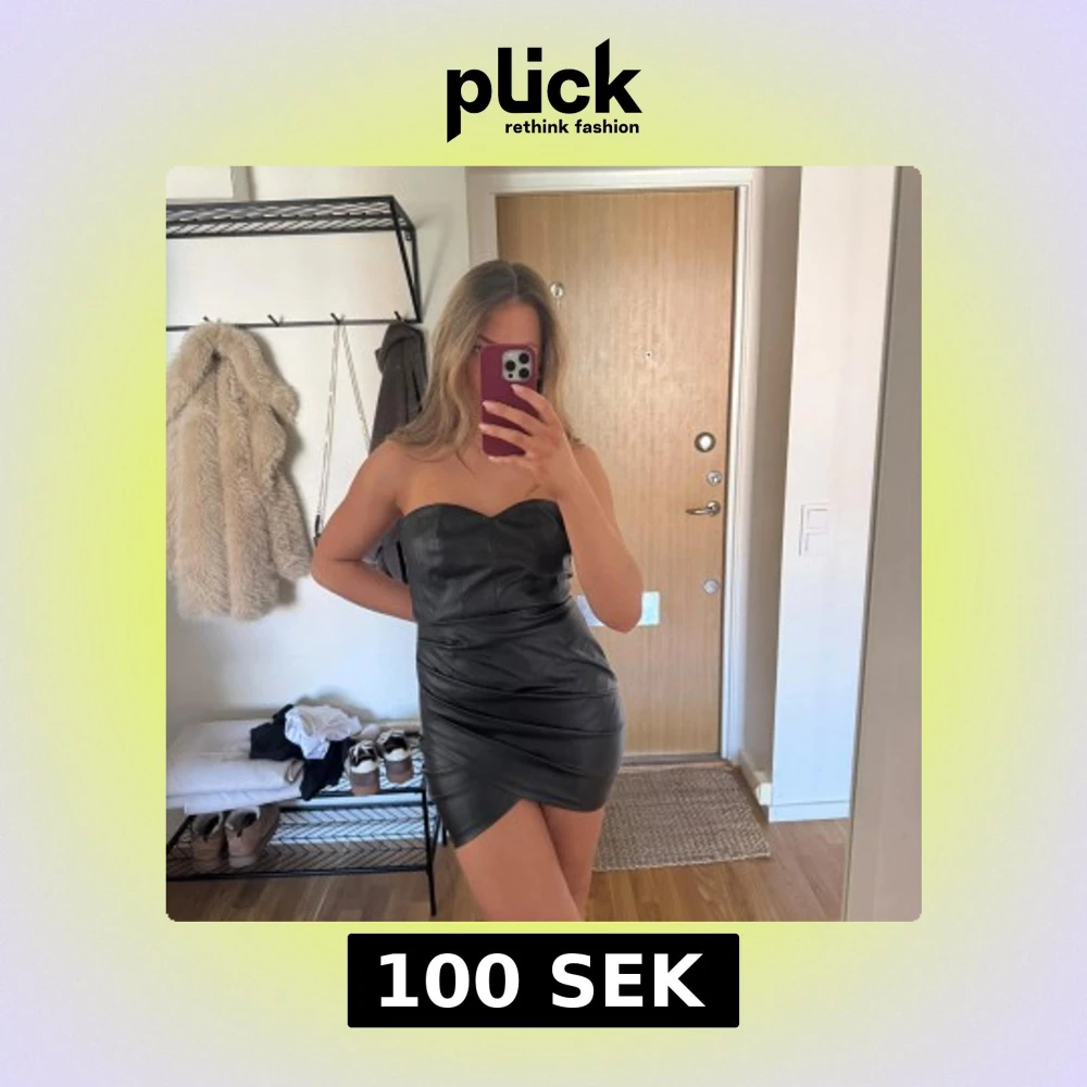 Säljer en svart axelbandslös klänning i skinnimitation med tight passform och kort längd. Klänningen har en stilren och modern look, perfekt för dig som vill sticka ut. Snyggt formad upptill och markerar midjan.