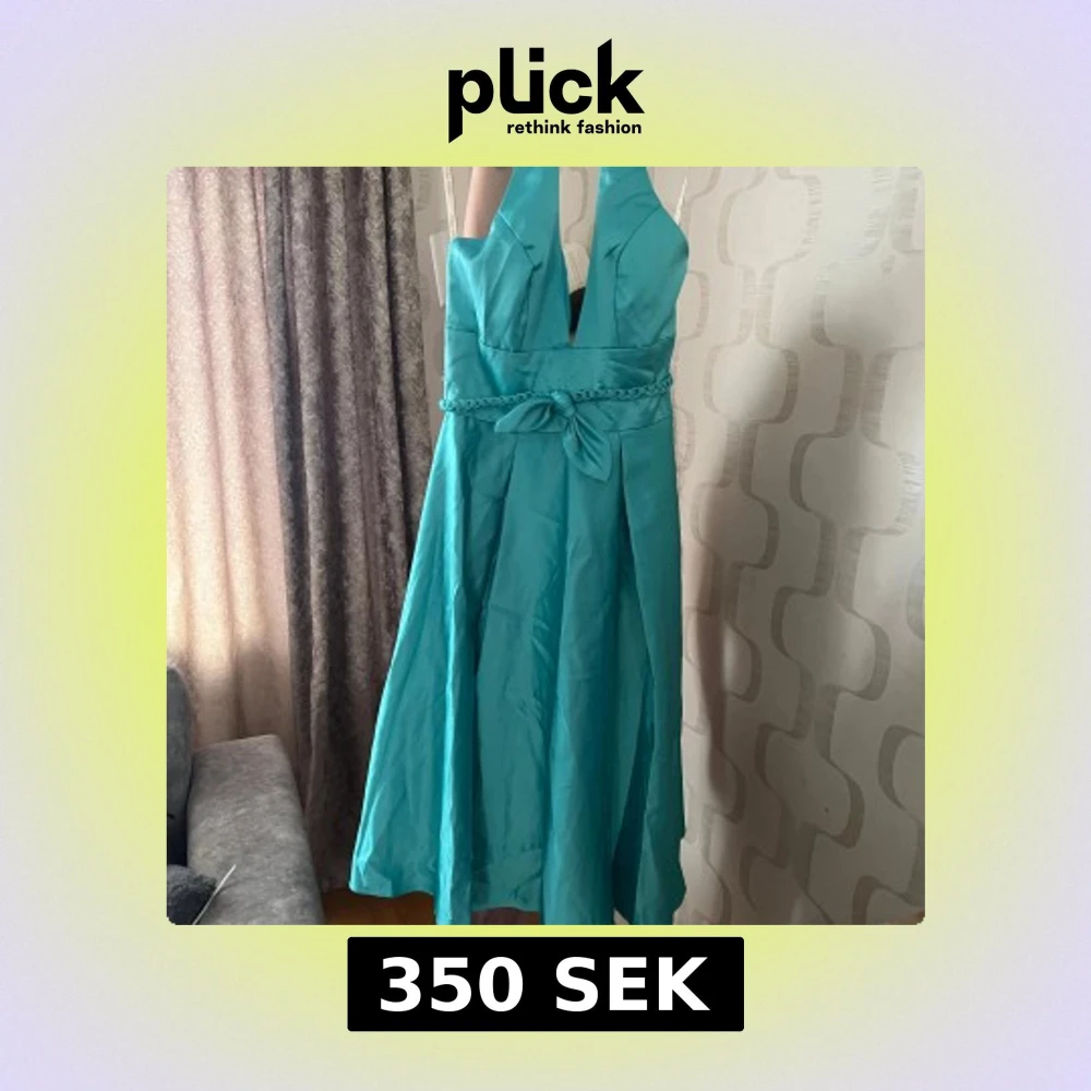 Säljer en turkos långklänning med djup v-ringning och halterneck. Klänningen har en markerad midja med flätat band och rosett framtill. Perfekt för bal eller festliga tillfällen.