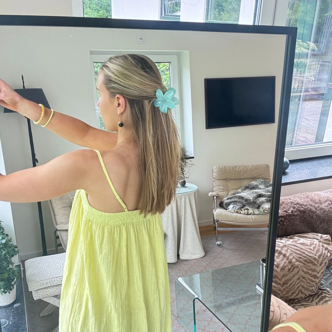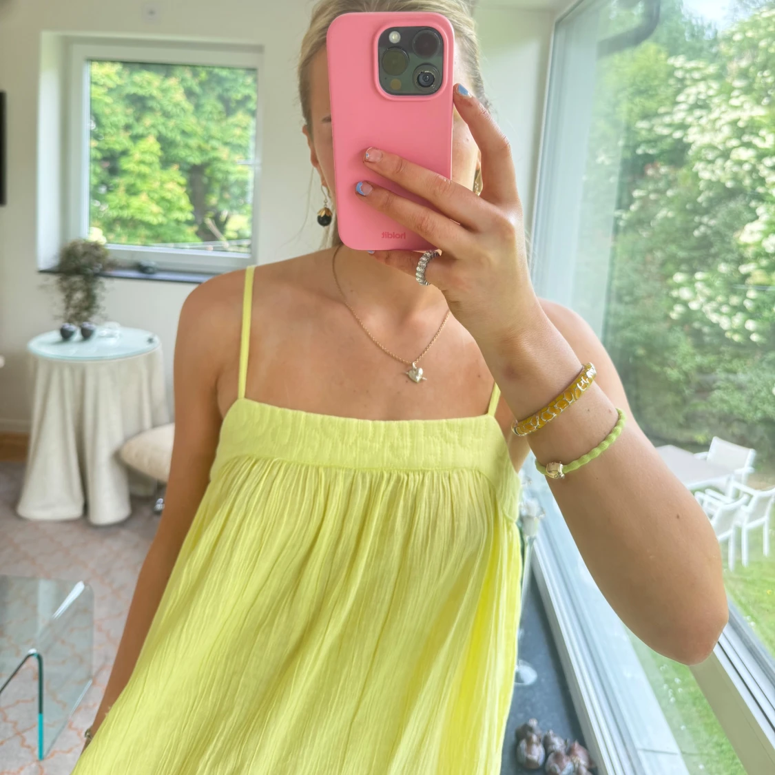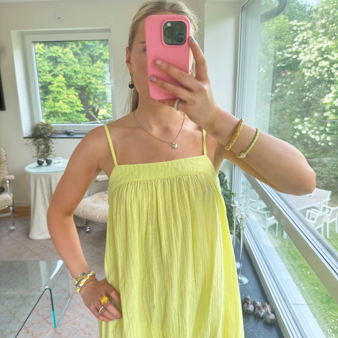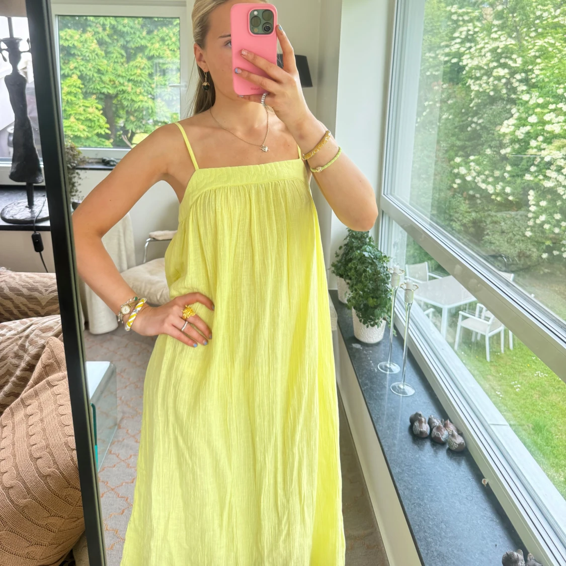 Superfin ljusgul långklänning med tunna axelband och flowy passform. Klänningen har en luftig och somrig känsla, perfekt för varma dagar. Materialet är lätt och faller snyggt. Enkel och stilren design som känns fräsch och trendig.