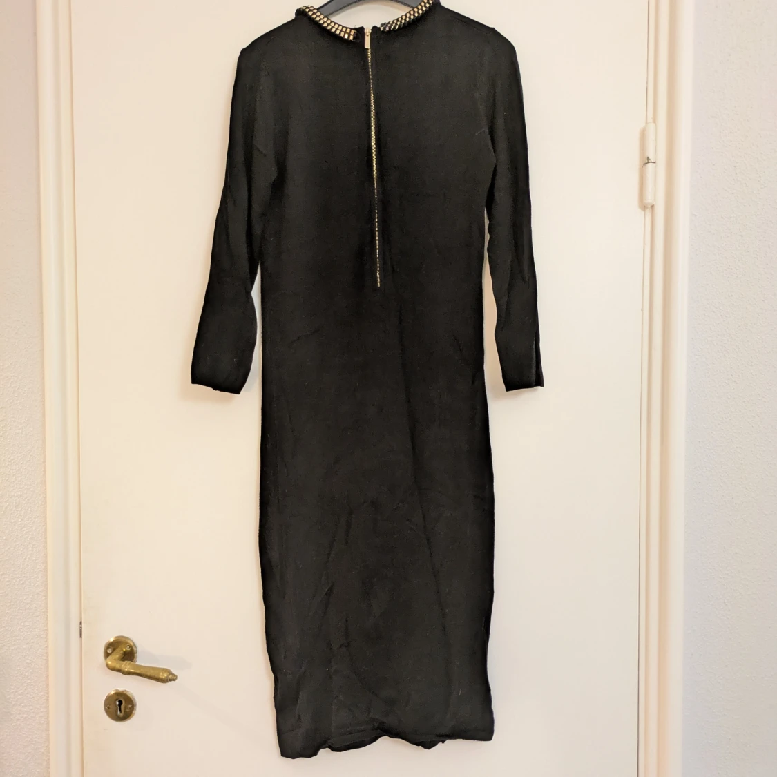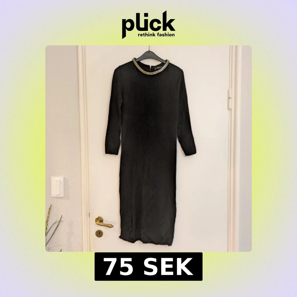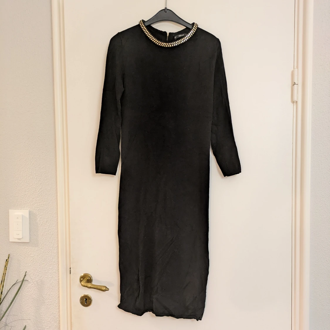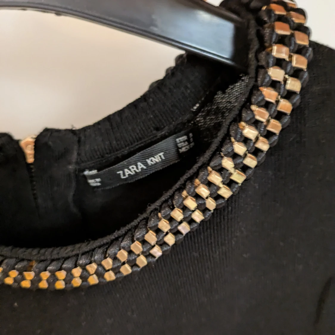 Finstickad svart klänning från Zara Knit med snygg guldfärgad detalj runt halsen. Klänningen har dragkedja bak för enkel påklädning. Är tight i passformen och väldigt skön mot huden. Perfekt för dig som vill ha en stilren och elegant look.