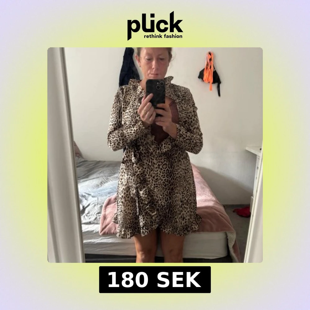 Så Snygg kort omlottklänning om jag hade varit lite mindre hade jag aldrig sålt den, jag är storlek M så den passar S. men försökt visa den ändå på! Så fin vid brösten, nere vid volangen vid ovan knä från Ally Bell med leopardmönster i beige, svart och brunt. Klänningen har långa ärmar, volangkant och knyt i midjan. Perfekt för dig som vill sticka ut med en trendig look.