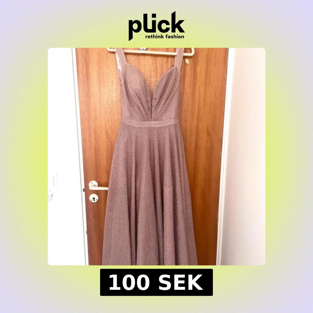 Supersnygg långklänning i champagnefärg med glittrigt tyg och djup v-ringning. Klänningen har breda axelband, markerad midja och ett svepande, utsvängt kjolparti. Perfekt för bal eller fest där du vill sticka ut och glänsa.