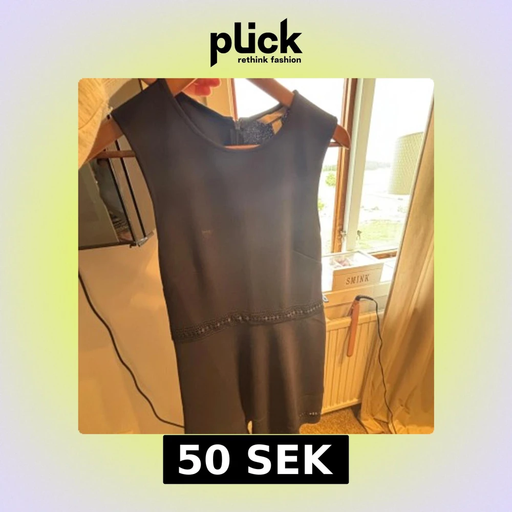 Snygg svart kortklänning med ärmlös design och rund halsringning. Klänningen har dekorativ spetsdetalj i midjan som ger en extra touch. Perfekt för dig som gillar stilrena och klassiska plagg.