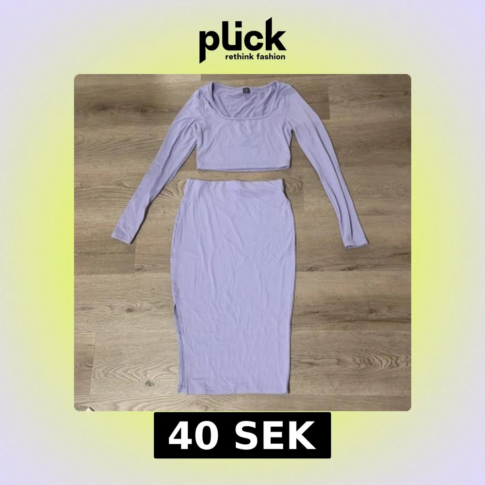 Säljer ett ljuslila ribbat set från SHEIN i storlek S. Kjolen har en smal passform och en snygg slits på sidan som ger extra edge. Materialet är stretchigt, perfekt för dig som gillar bekväma och trendiga plagg.
