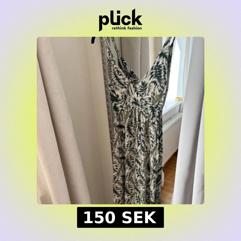 Supersnygg långklänning med smala axelband och v-ringning. Klänningen har ett grönt och vitt bladmönster, knyt i midjan och är perfekt för sommardagar. Lätt och luftig känsla, passar dig som gillar en avslappnad men trendig stil. Okänt märke, köpt från en marknad i Belgien.