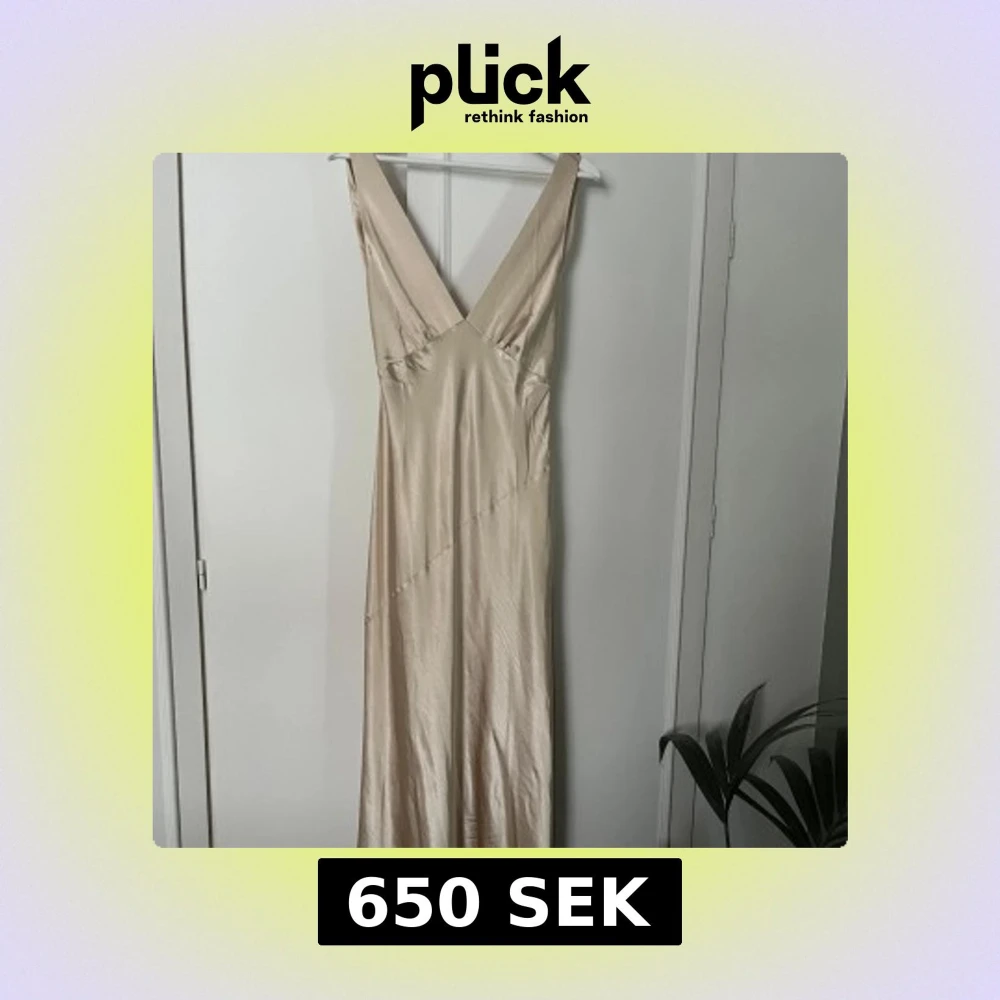 Elegant champagnefärgad långklänning i satin med djup v-ringning och öppen rygg. Klänningen har en smickrande passform och ett vackert fall, perfekt för festliga tillfällen såsom bal.