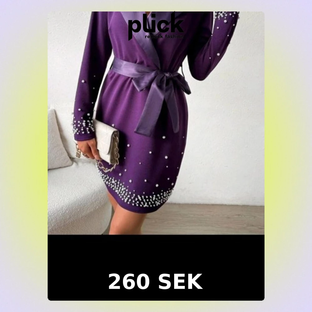 Snygg lila klänning med pärlor längs ärmar och nederkant. Klänningen har en omlott-look med breda slag, knytskärp i midjan och lång ärm. Materialet ser ut att vara mjukt och följsamt, perfekt för dig som vill sticka ut med eleganta detaljer.