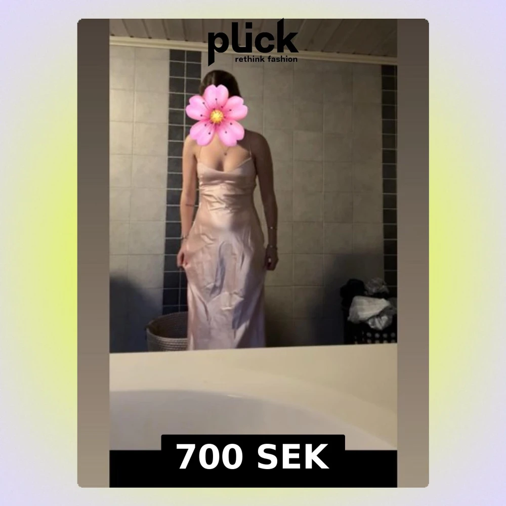Säljer en ljusrosa långklänning med smala axelband och v-ringad front. Klänningen har en slät och glansig yta som ger en lyxig känsla, perfekt för speciella tillfällen. Den är tyvärr för stor för mig och kommer därför inte användas