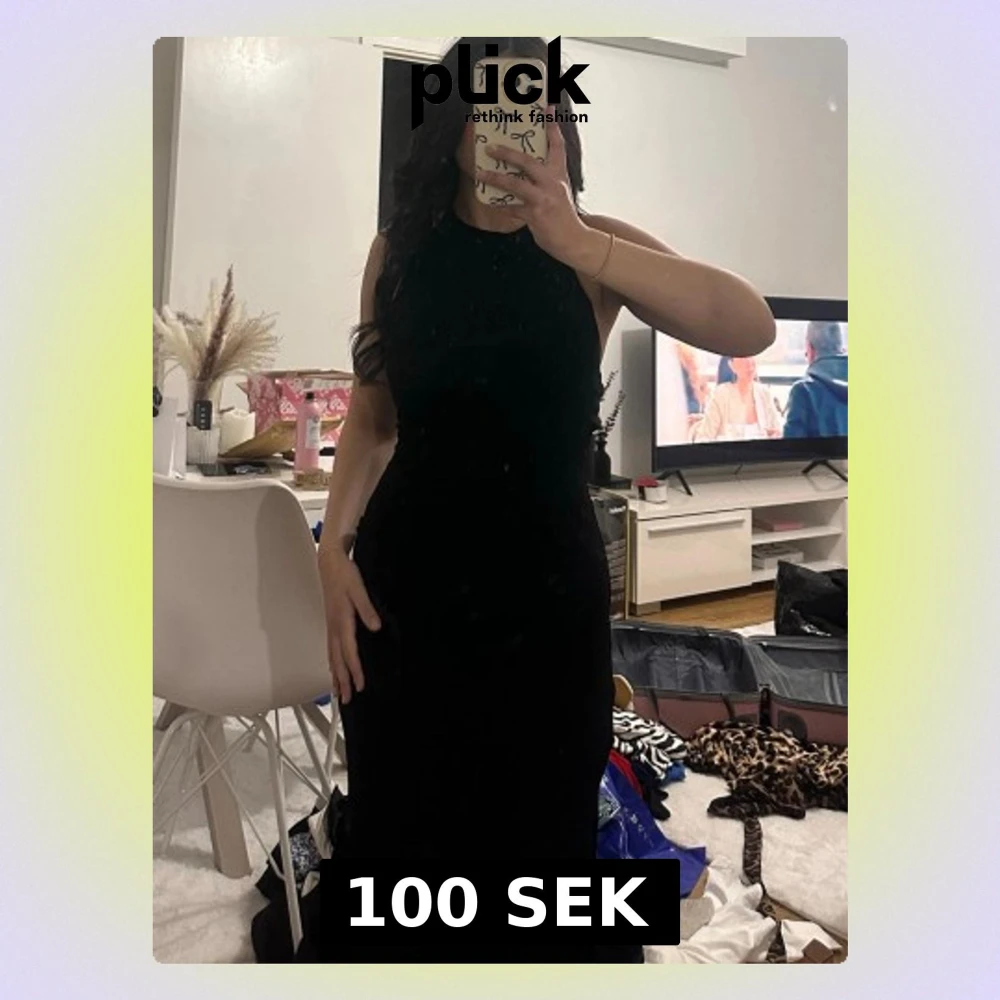Snygg svart långklänning med hög halsringning och ärmlös design. Klänningen har en figurnära passform och en slits på sidan som ger en extra touch. Perfekt för dig som vill ha en stilren och elegant look. Storlek S