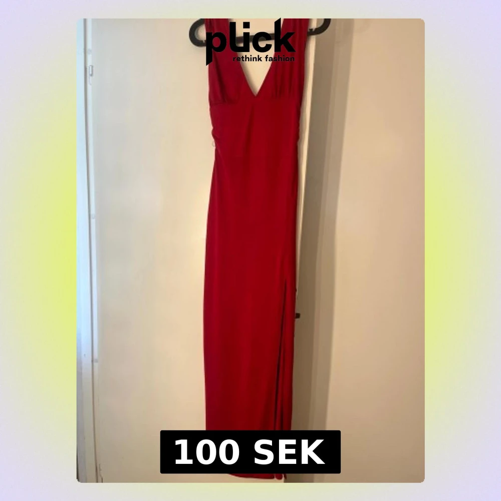 Snygg röd långklänning med djup v-ringning och slits framtill. Klänningen har breda axelband och en figurnära passform som framhäver siluetten. Perfekt för dig som vill sticka ut med en elegant look.