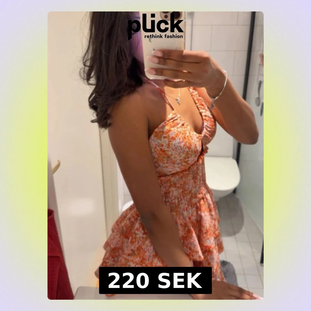 Supersöt kort klänning med blommigt mönster i orange, vit och rosa. Klänningen har smock i midjan, volangkjol och tunna axelband. Perfekt för varma dagar och ger en riktigt somrig vibe. Materialet känns lätt och luftigt.🌸☺️