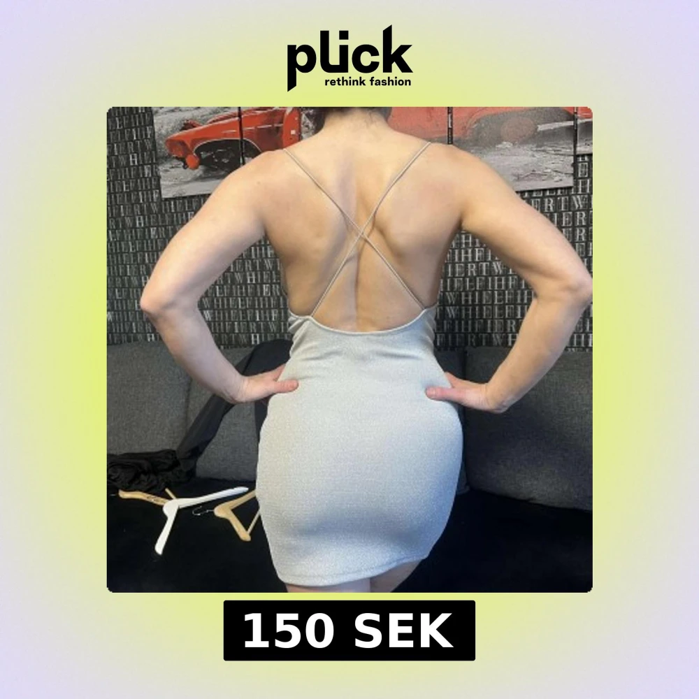 Snygg och glittrig silverfärgad klänning med smala axelband och öppen rygg. Klänningen har en kort längd och en liten slits framtill för extra stil. Perfekt för festliga tillfällen.