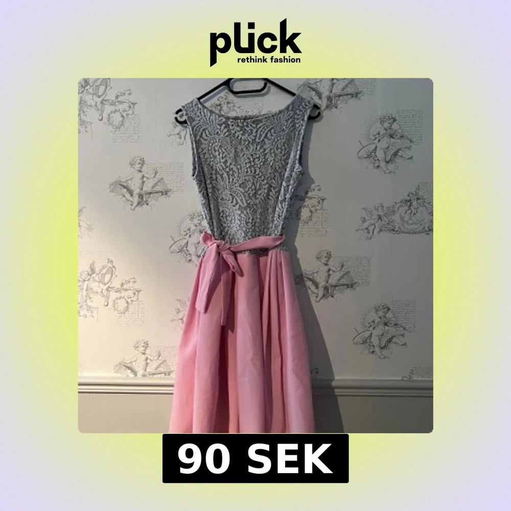 Supersöt klänning med grått spetstopp och vid rosa kjol. Midjan markeras av ett brett band med rosett. Ärmlös modell med rund halsringning, perfekt för speciella tillfällen. Storlek S