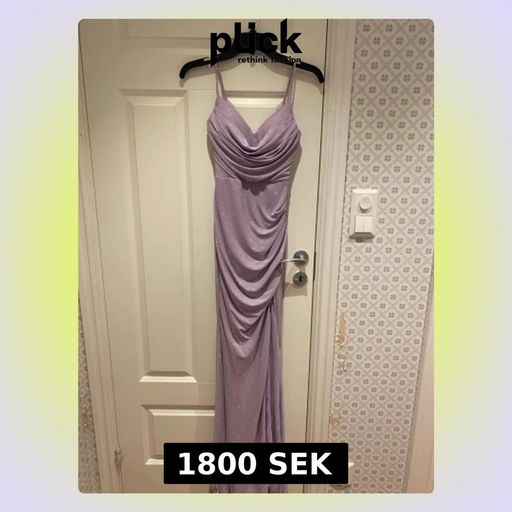 Säljer en oanvänd ljuslila långklänning köpt i Maiami med smala axelband och draperad front. Klänningen har glittriga detaljer över hela tyget och en figurnära passform med slits framtill. Perfekt för bal eller för större evenemang!