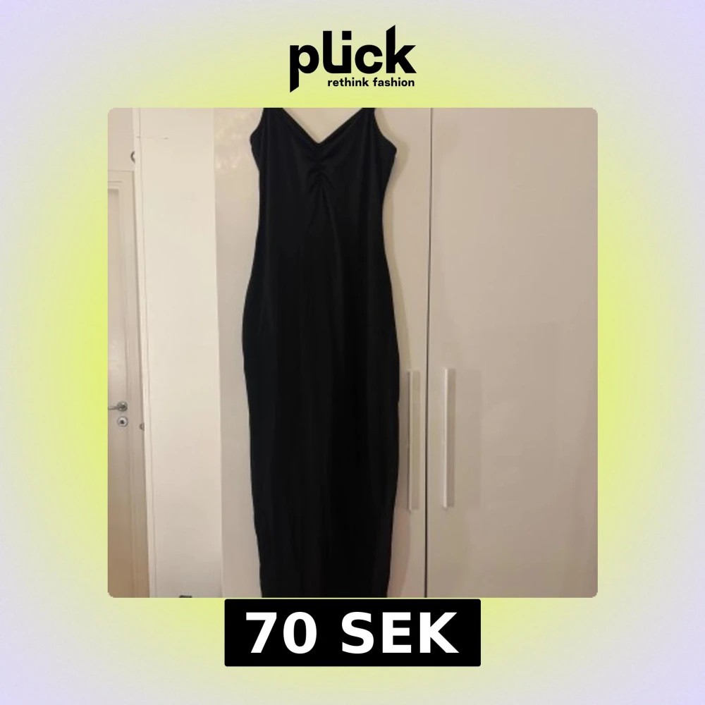 Snygg svart långklänning med smala axelband och v-ringning framtill. Klänningen har en rynkad detalj vid bysten och en slits på sidan.