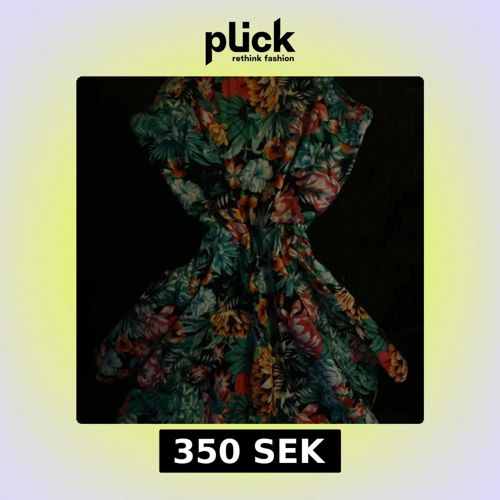 Säljer en färgglad blommig mini klänning med tropiskt mönster i grönt, rött, gult och blått. Klänningen har ärmlös design perfekt för varma dagar. Tyget är lätt och luftigt, vilket gör den superbekväm att bära.