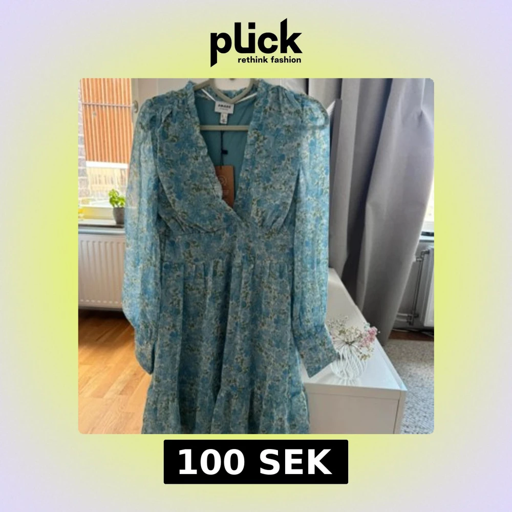 Supersöt kortklänning från Aware i ljusblått med blommigt mönster. Klänningen har v-ringning, långa puffärmar med knappar vid ärmslut och markerad midja. Perfekt för vår och sommar, i ett lätt och luftigt material. Oanvänd