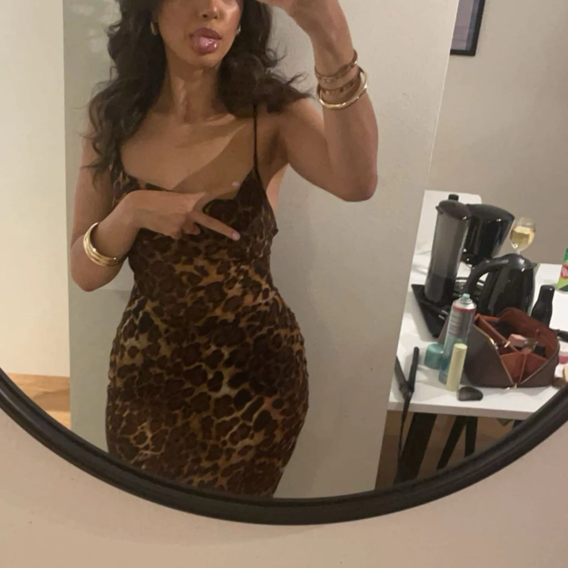 Säljer en snygg leopardmönstrad Lång klänning med tunna axelband och snörning i ryggen. Klänningen har en tight passform och är gjord i ett lätt, glansigt material som känns lyxigt. Perfekt för dig som vill sticka ut med en djärv look. Längden är lång, för mer bilder fråga 🌺