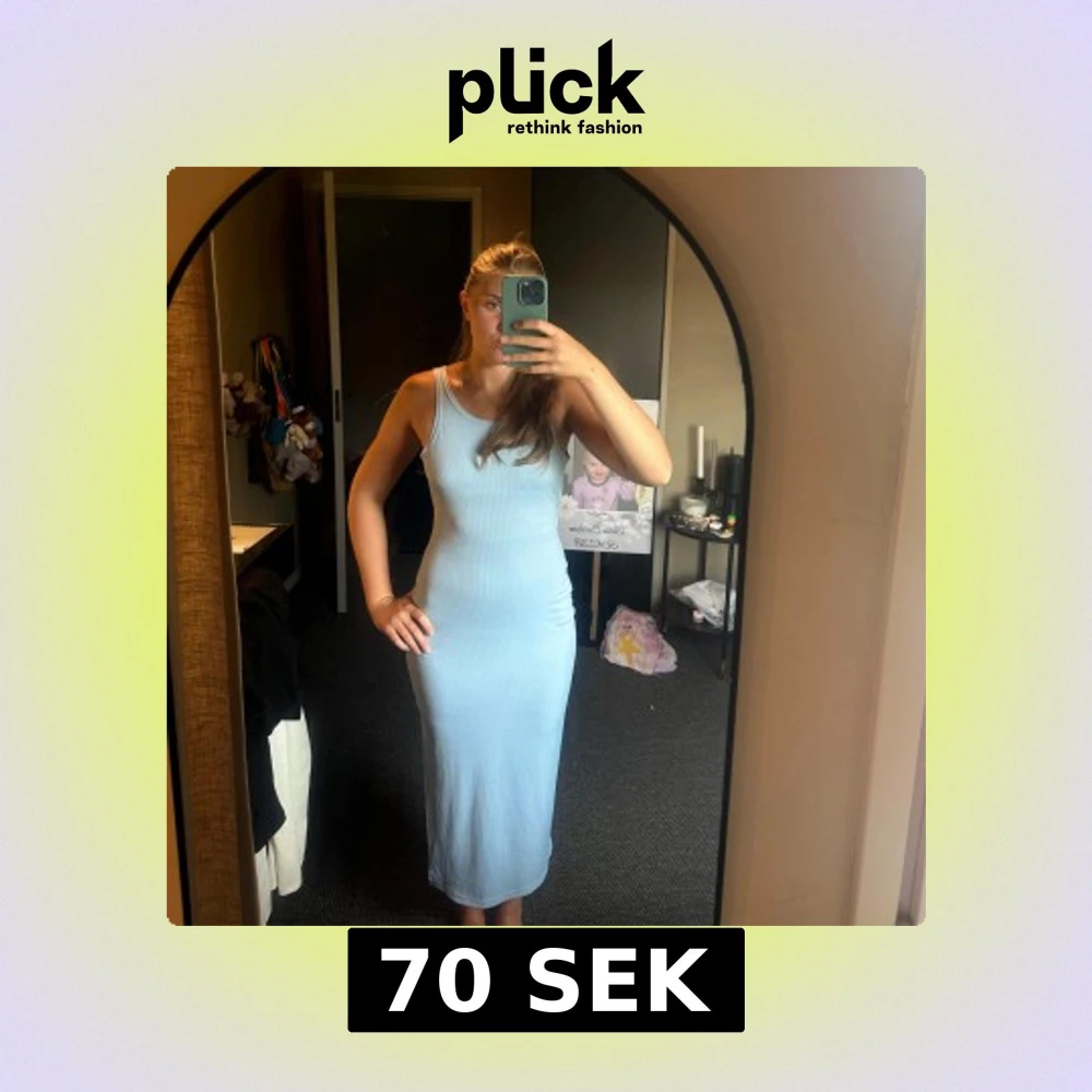 Säljer en ljusblå ribbad långklänning med tight passform. Klänningen är ärmlös med breda axelband, har en snygg öppen rygg med twistad detalj och en slits på sidan. Perfekt för sommarens varma dagar och ger en fräsch look.