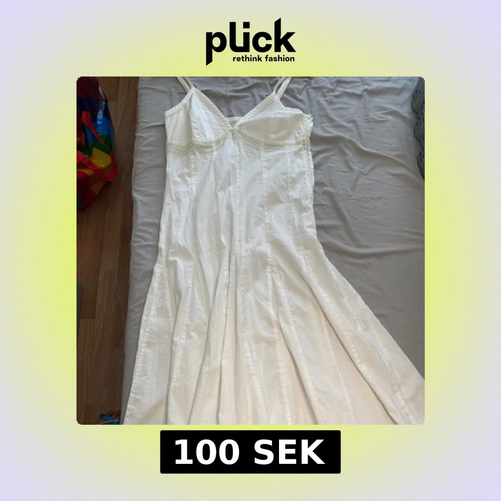 Vit klänning med smala axelband och v-ringad hals. Klänningen har fina sömdetaljer och lätt volang nertill. Perfekt för varma dagar och har en romantisk känsla med sin enkla, eleganta design. Storlek S.